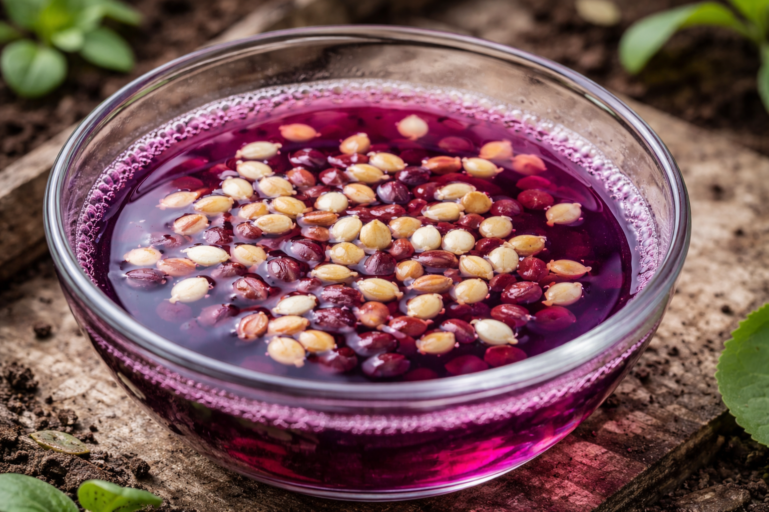 Zorg ervoor dat je de vloeistof door een gaasje zeeft voordat je het stoffen zakje met de zaden onderdompelt.
