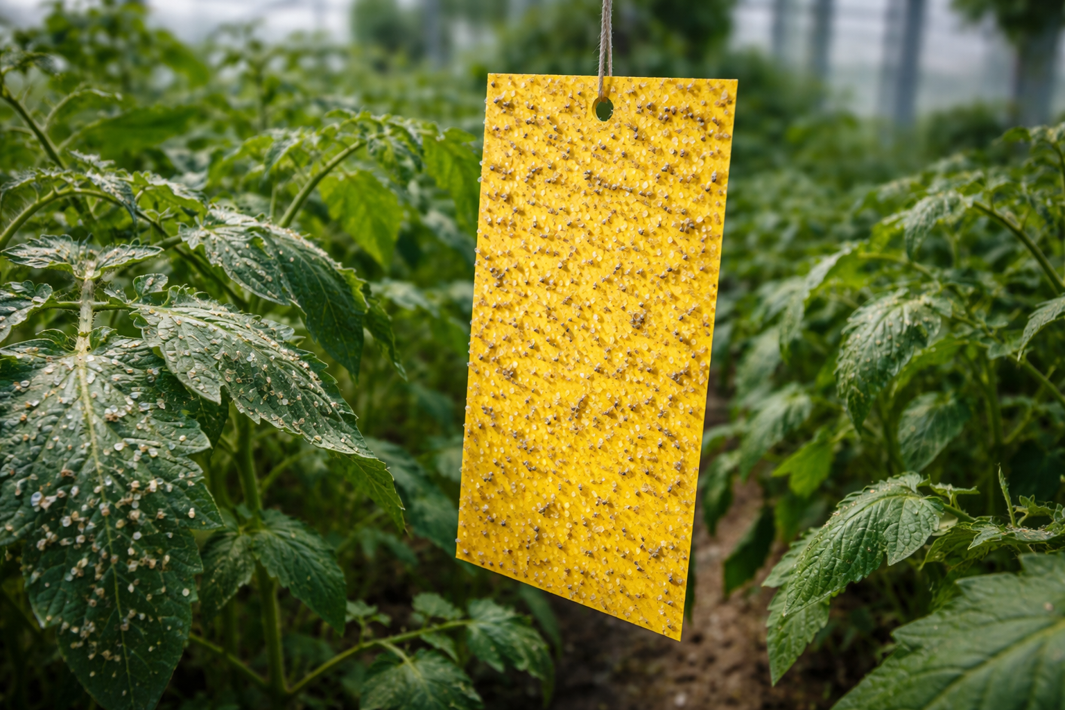 Hang felgeel gekleurde lijmschermen over de toppen van de planten