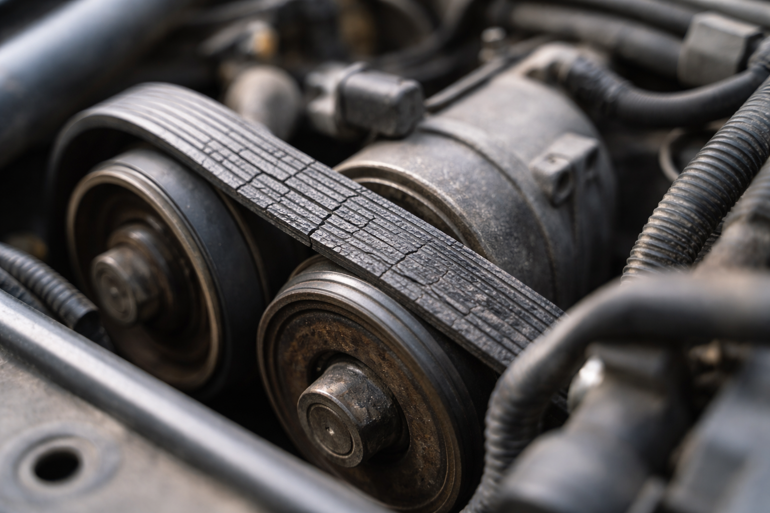 Open de motorkap en inspecteer visueel aandrijfriemen voor diepe scheuren of delaminaties.