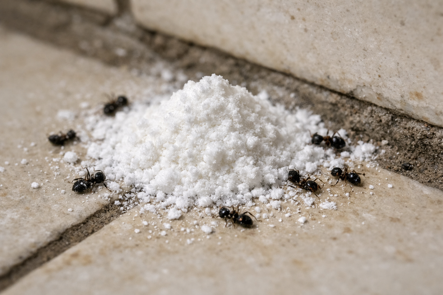 Strooi zuiveringszout royaal over de plekken waar mieren het huis binnenkomen: kieren in de vloer, vensterbanken en deuropeningen.
