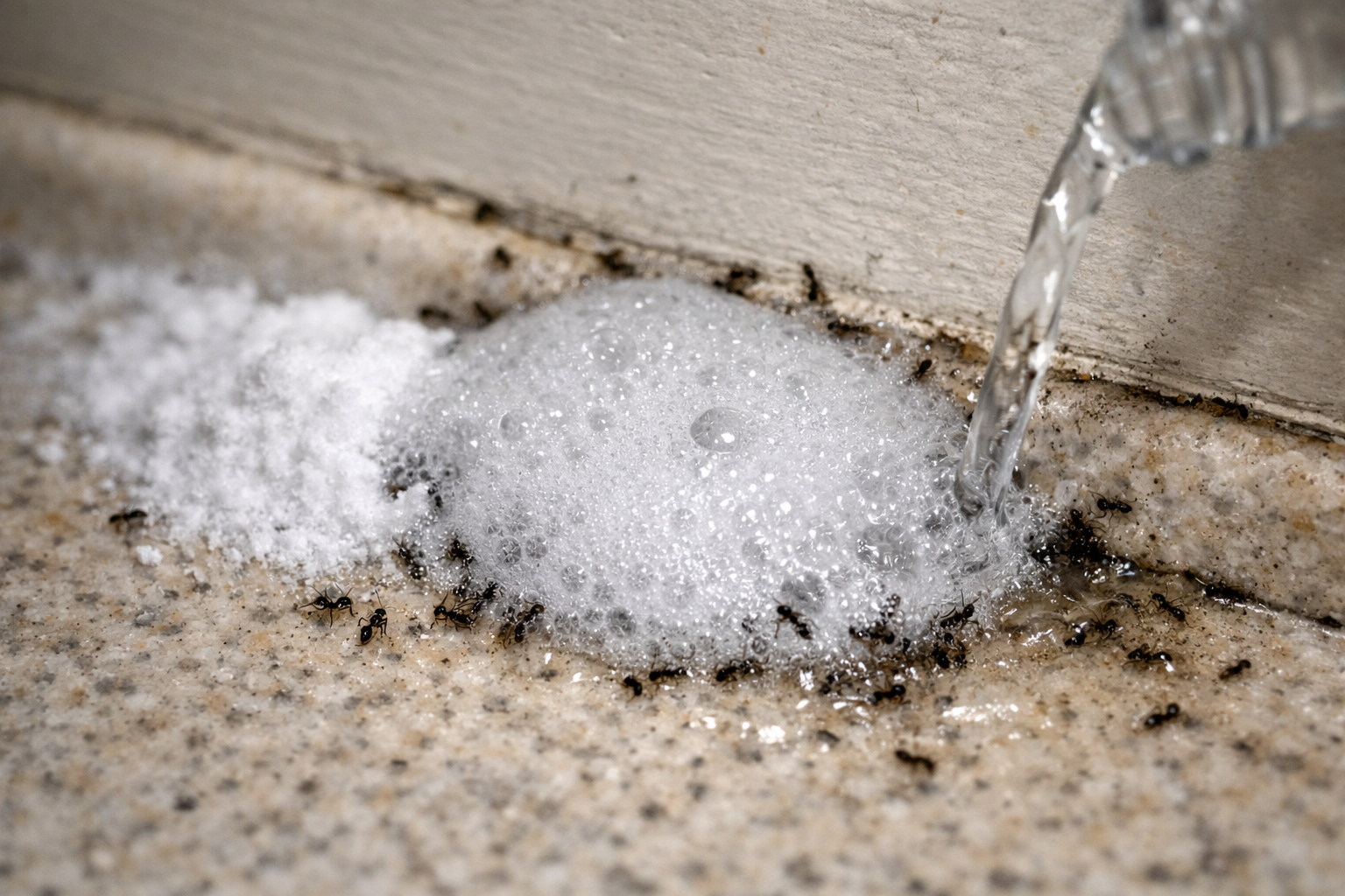Wanneer een alkali en een zuur elkaar ontmoeten, vindt er een heftige chemische reactie plaats waarbij het volgende vrijkomt kooldioxide. Voor insecten wordt dit sissende mengsel een onoverkomelijke barrière. Zuiveringszout vernietigt de buitenste schil van het ongedierte en tafelazijn verwart hun navigatie-instellingen.