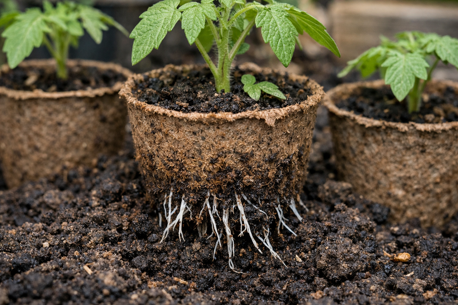 Speciale aandacht moet worden besteed aan plantdiepte. Tomaten zijn uitstekend in het opbouwen van extra wortels op de stengel, dus als je ze in biologische bakken plukt, kun je ze een beetje ingraven. Dit zal de struik in de toekomst extra stabiliteit en sterke voeding geven.