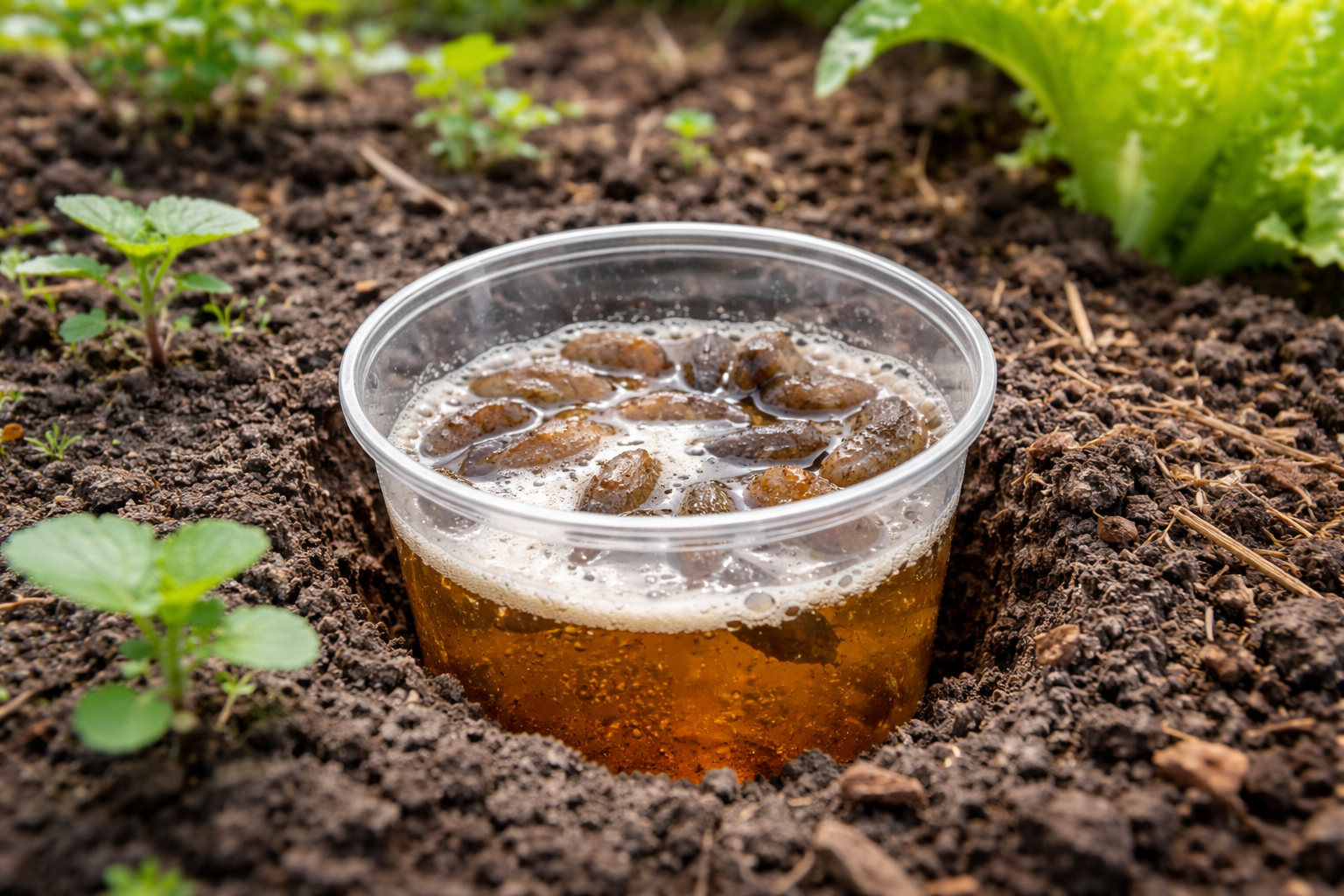 Zorg ervoor dat je de rand van de beker ongeveer een paar centimeter boven de grond laat, zodat een aardpad of nuttige tuinkever niet per ongeluk in de vloeistof valt.