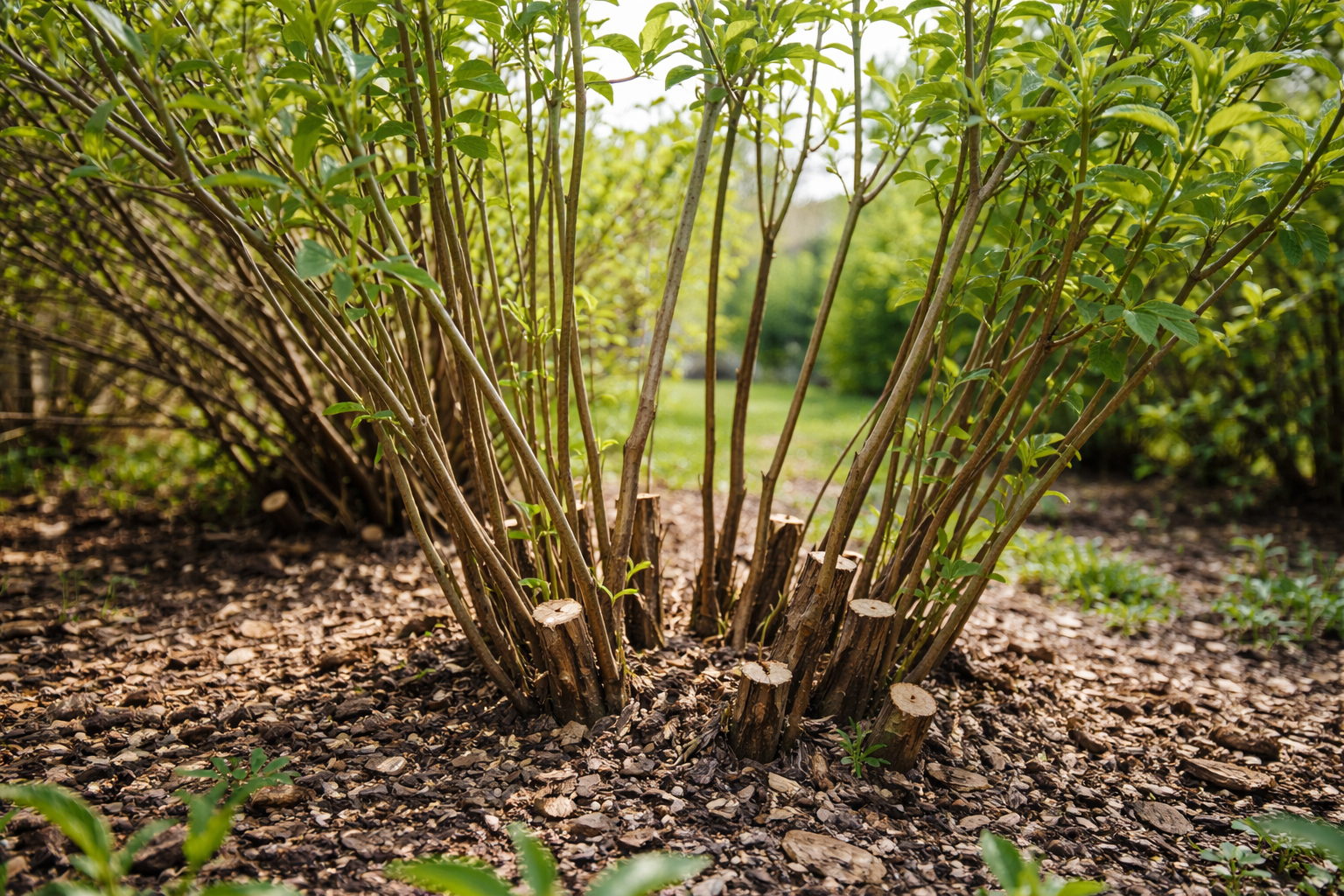 Deze moeten bijna tot aan de basis worden afgezaagd om een oude struik radicaal te verjongen.