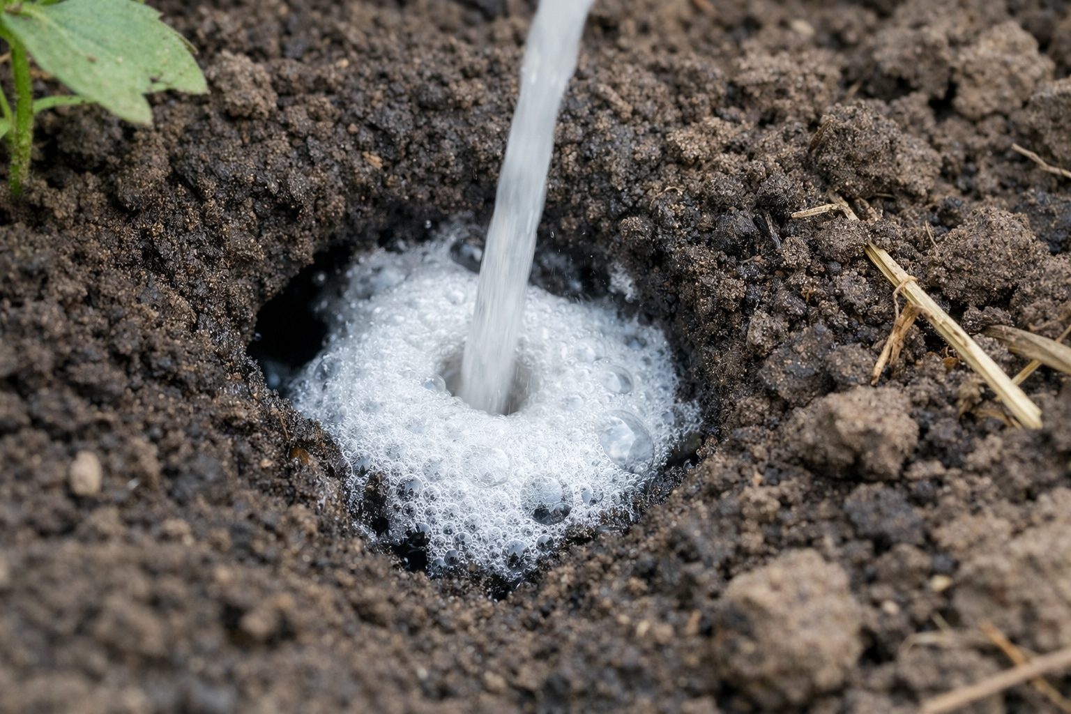 Giet de resulterende alkalische vloeistof direct in het gat dat we vonden.