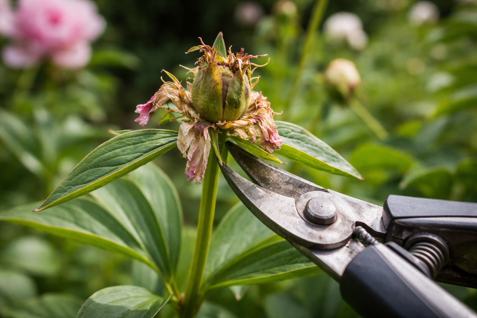 Geheime nuance: knip alleen de verwelkte bloem zelf en een klein deel van de stengel af, strikt tot het eerste echte, goed ontwikkelde blad.