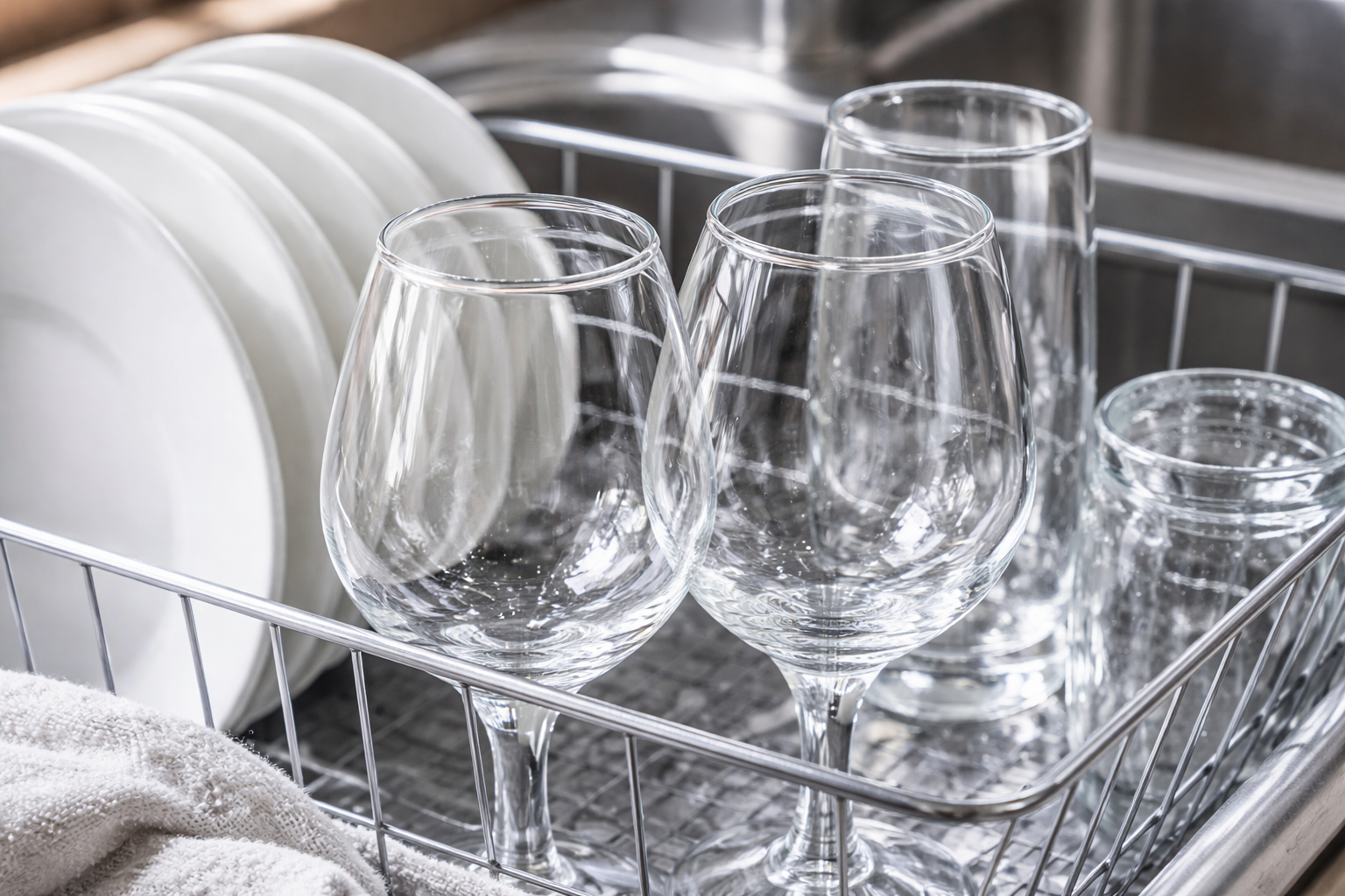 De grootste vijand van helder glas is hard water en afwasmiddelresten. Als we het schuim gewoon afspoelen, drogen de mineralen op en vormen ze dat onaangename residu. witte aanslag.