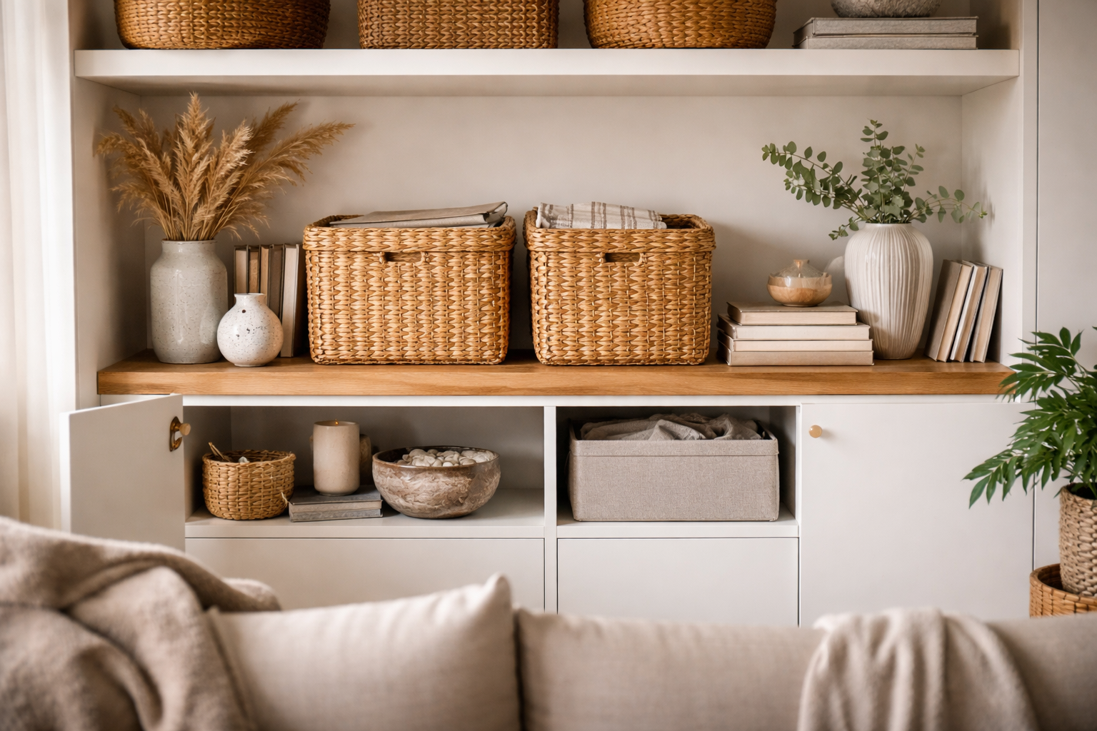 Laat alleen die alledaagse voorwerpen op open oppervlakken liggen die je ook echt elke dag gebruikt.