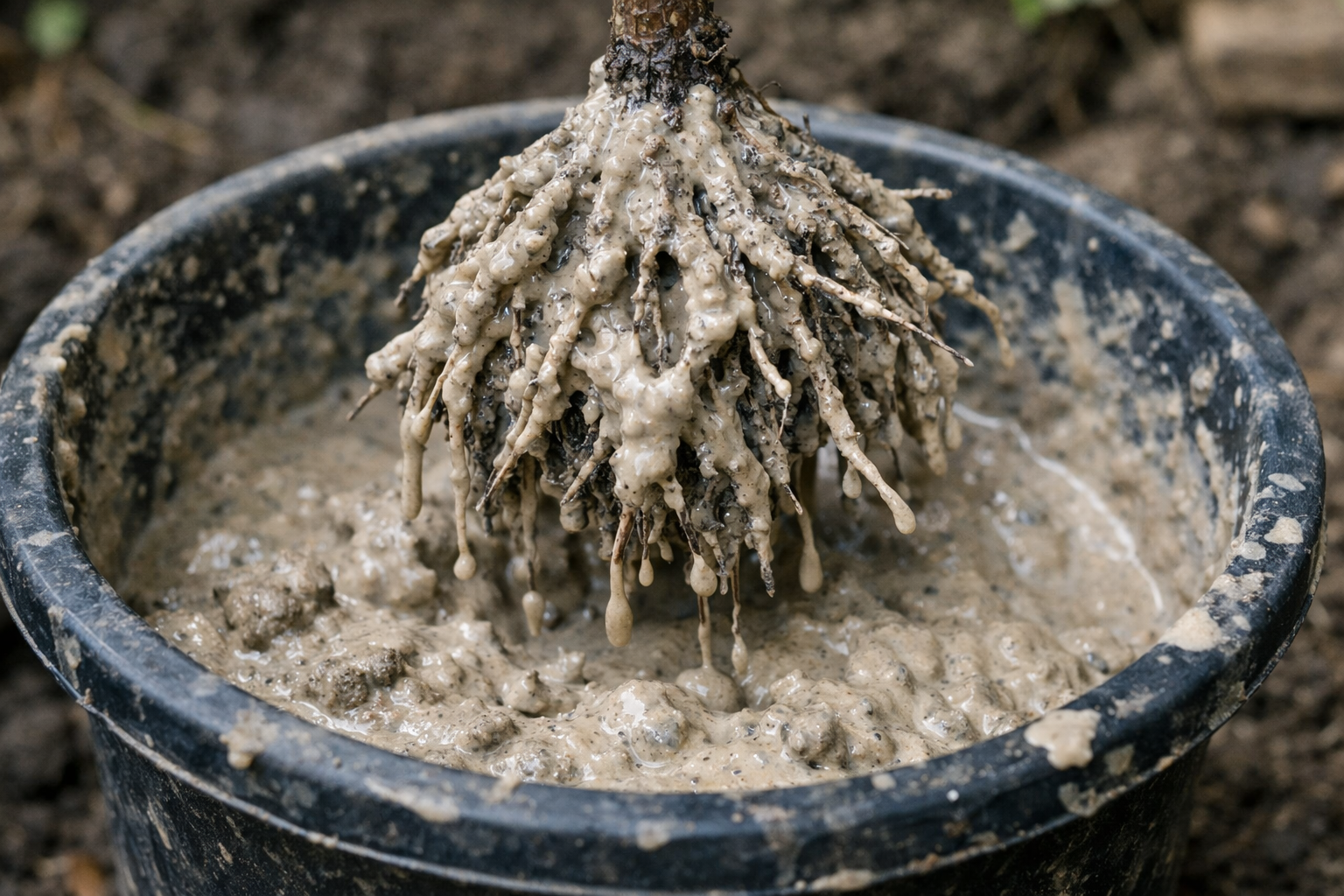 Wanneer plantgoed wordt opgegraven, verliezen de kleine zuigende wortels onmiddellijk vocht. In de open lucht kunnen ze binnen enkele tientallen minuten afsterven. Daarom gebruiken ervaren tuiniers altijd kleipleisterdat fungeert als een kunstmatige beschermende cocon.