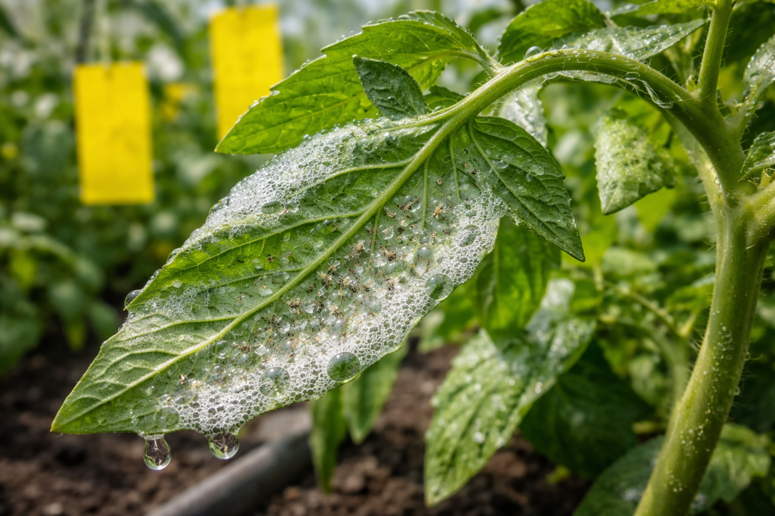 De eerste stap is het installeren van de gele lijmvallen. Deze kleur trekt op magische wijze volwassen dieren aan. Dit is echter maar het topje van de ijsberg, want de belangrijkste vijandelijke krachten zijn geconcentreerd aan de onderkant van het blad in de vorm van eieren en larven.