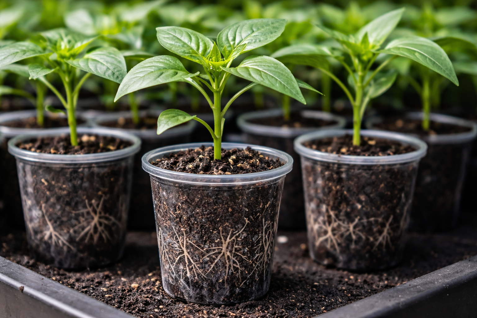 Donkere containers zijn beter in staat om de warmte vast te houden die paprika’s nodig hebben, terwijl transparante wanden de kweker in staat stellen om de conditie van het wortelstelsel visueel te controleren.