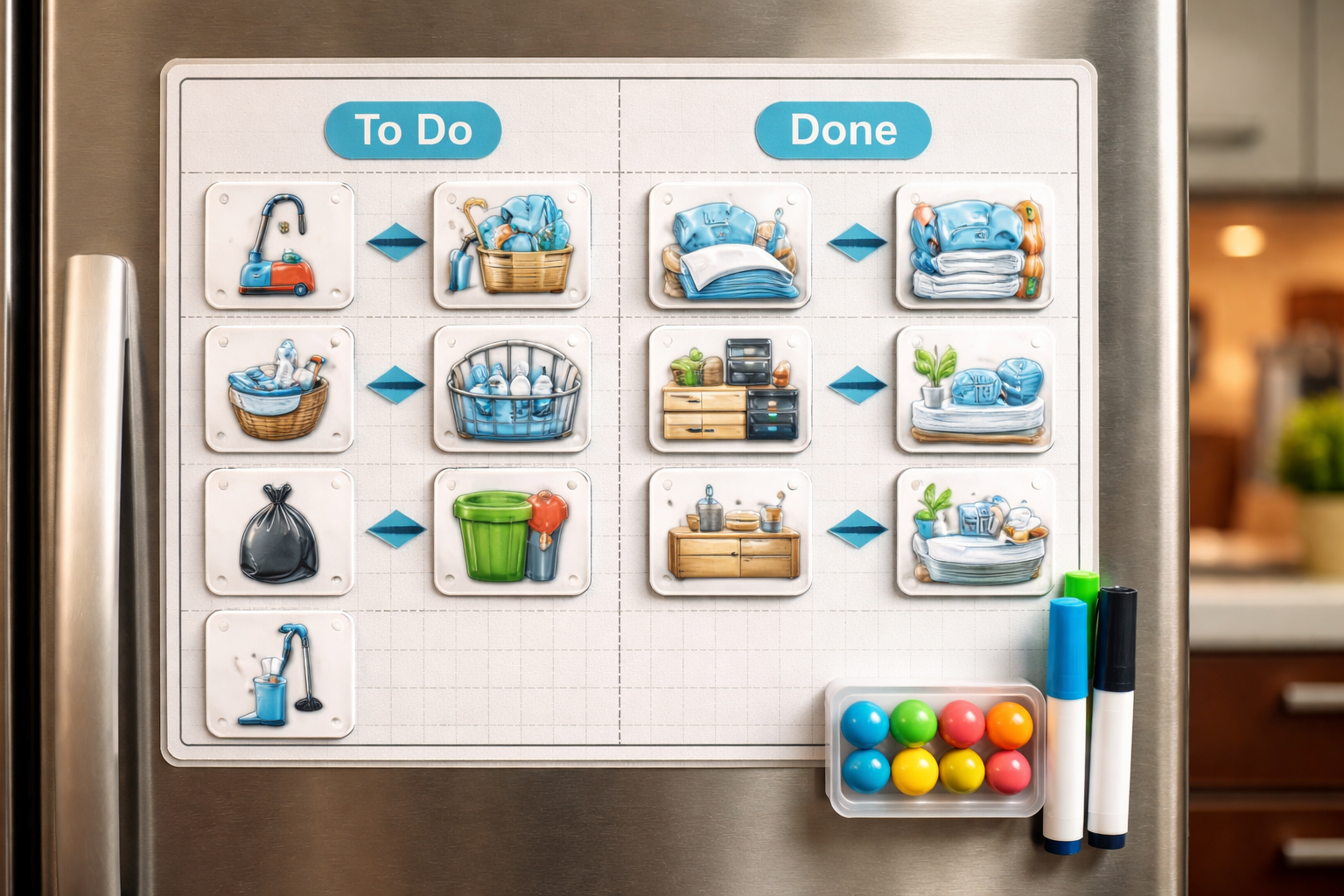 Geheime nuance: maak een visueel bord met magneten waarop elk gezinslid zelfstandig voltooide taken kan markeren, door ze gelukkig te verplaatsen van de kolom “te doen” naar de kolom “gedaan”.