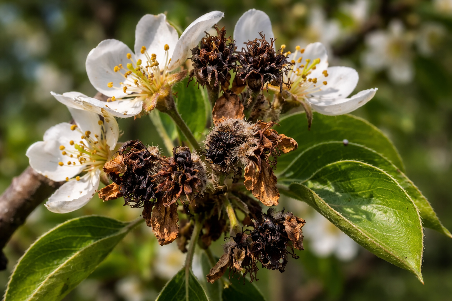 Wanneer bacteriële brandwond het vaatstelsel van de boom aantast, kan de perenboom er aan het begin van het seizoen gezond uitzien. Maar op het moment dat de sapstroom actief is, snijdt de infectie de voeding van de takken af. Hierdoor krijgen zelfs de meest weelderige bloemen holle bloemen. Het gevolg is dat zelfs de weelderigste bloeiers holle bloemen krijgen.