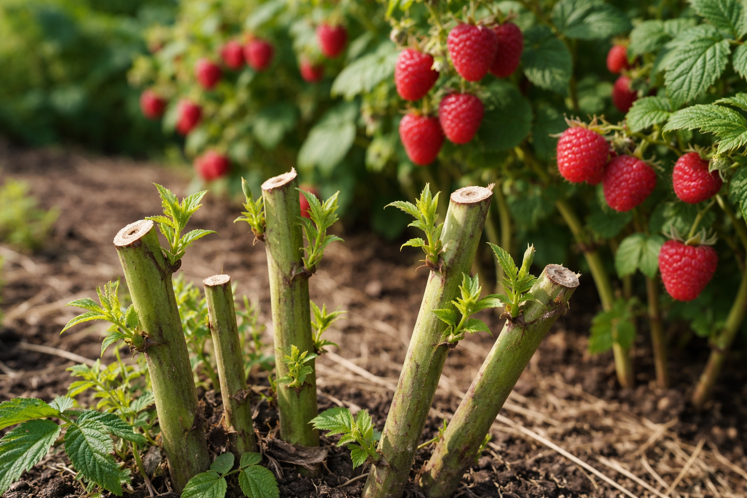 Remontante variëteiten voor de herfstoogst worden volledig onder de wortel afgesneden.