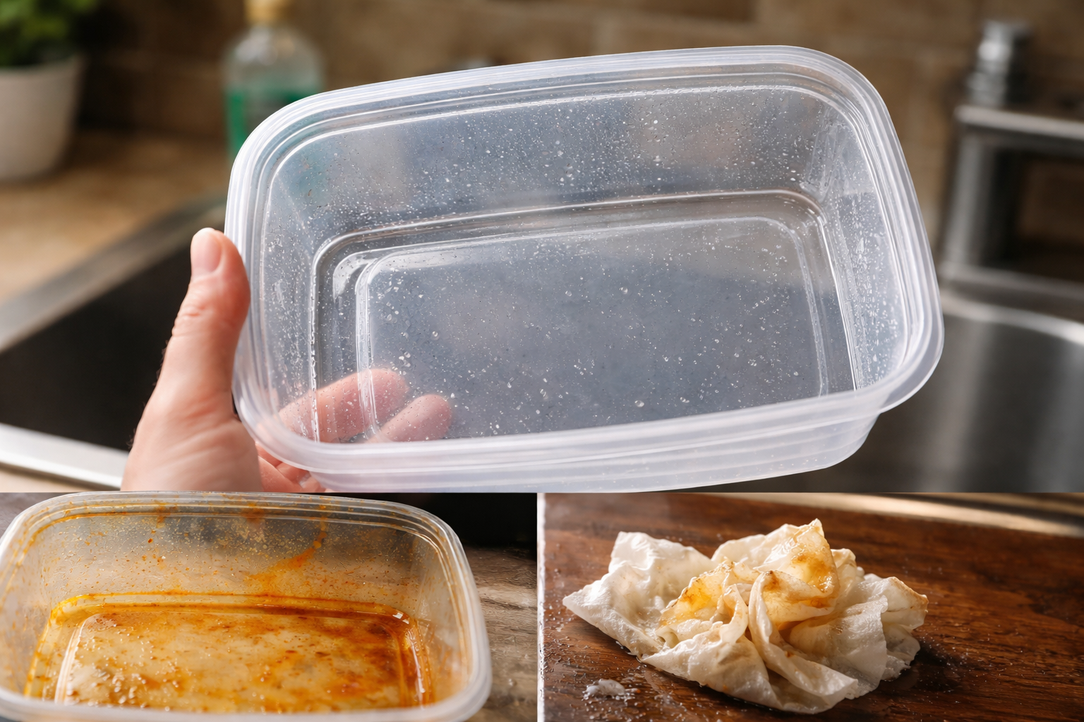 Hedendaags voedingsplastic heeft microscopisch kleine poriën. Wanneer deze in contact komen met warm voedsel, zetten ze uit en nemen ze het voedsel letterlijk in zich op. hardnekkig vet en kleurpigmenten. Als we de container met een gewone spons proberen schoon te maken, smeren we het vuil alleen op het oppervlak zonder in de structuur van het materiaal door te dringen.