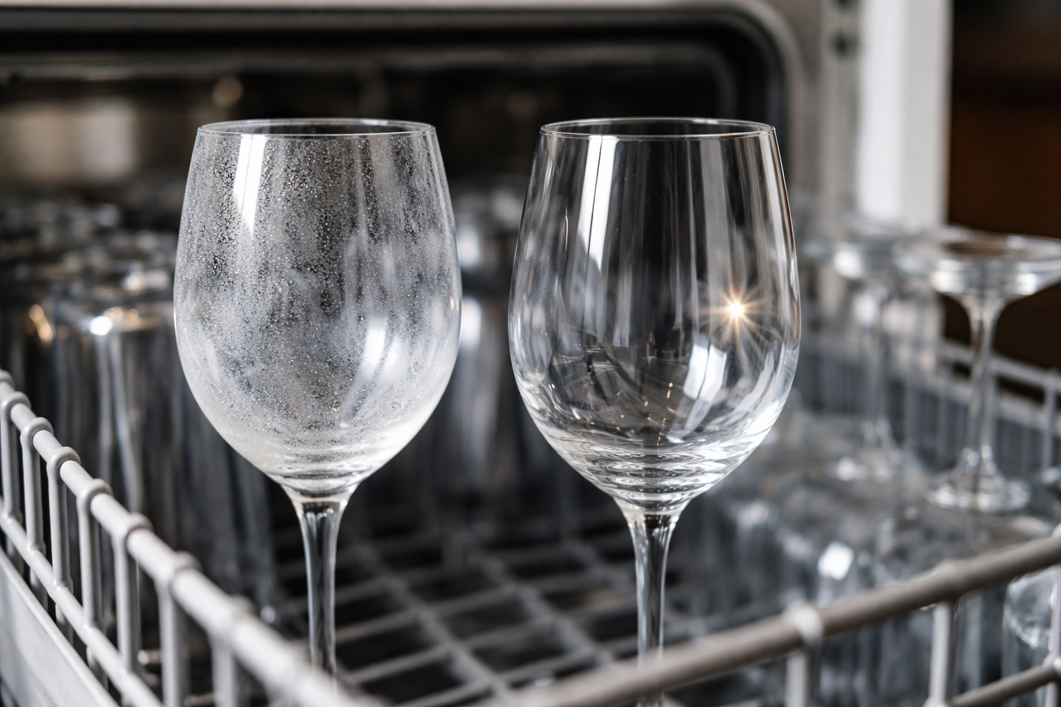Veel mensen geven de schuld aan slechte kwaliteit gel of wastabletten, maar de echte oorzaak ligt ergens anders. De grootste vijand van een perfecte glans is hard water. Het bevat enorme hoeveelheden calcium- en magnesiumzouten. Wanneer vocht verdampt van het oppervlak van glazen en platen, minerale neerslag De minerale neerslag verdwijnt niet, maar hecht zich aan het glas en vormt een dichte kalk.