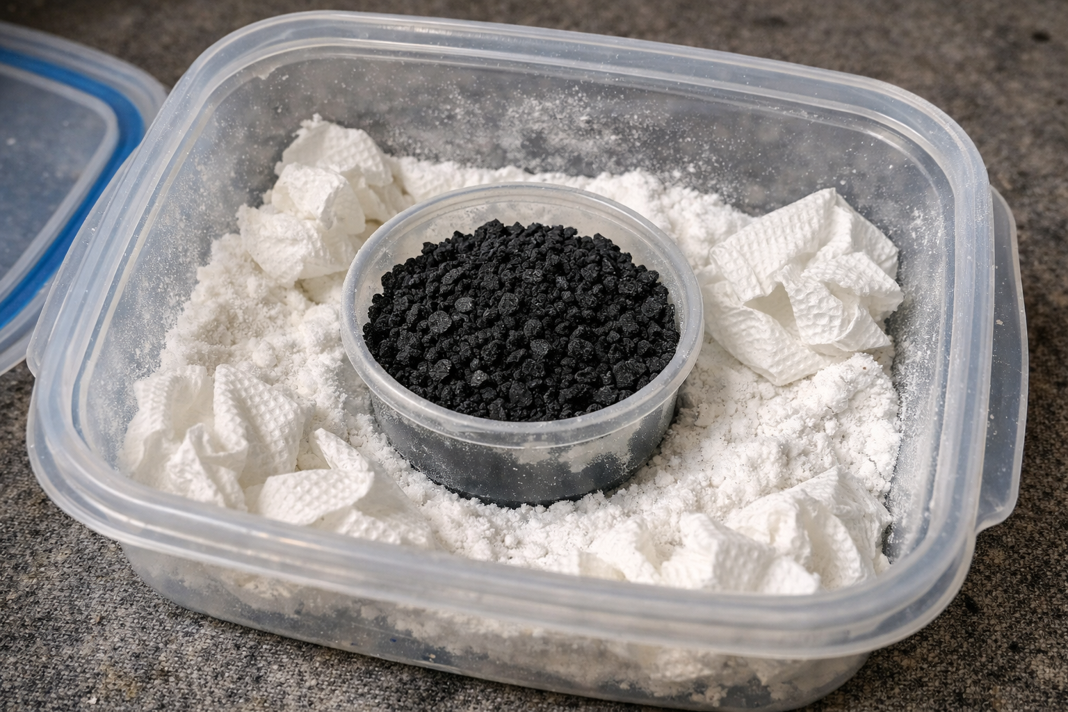 Laat geplette actieve kool ’s nachts in gesloten kasten liggen om vluchtige chemische verbindingen te absorberen.