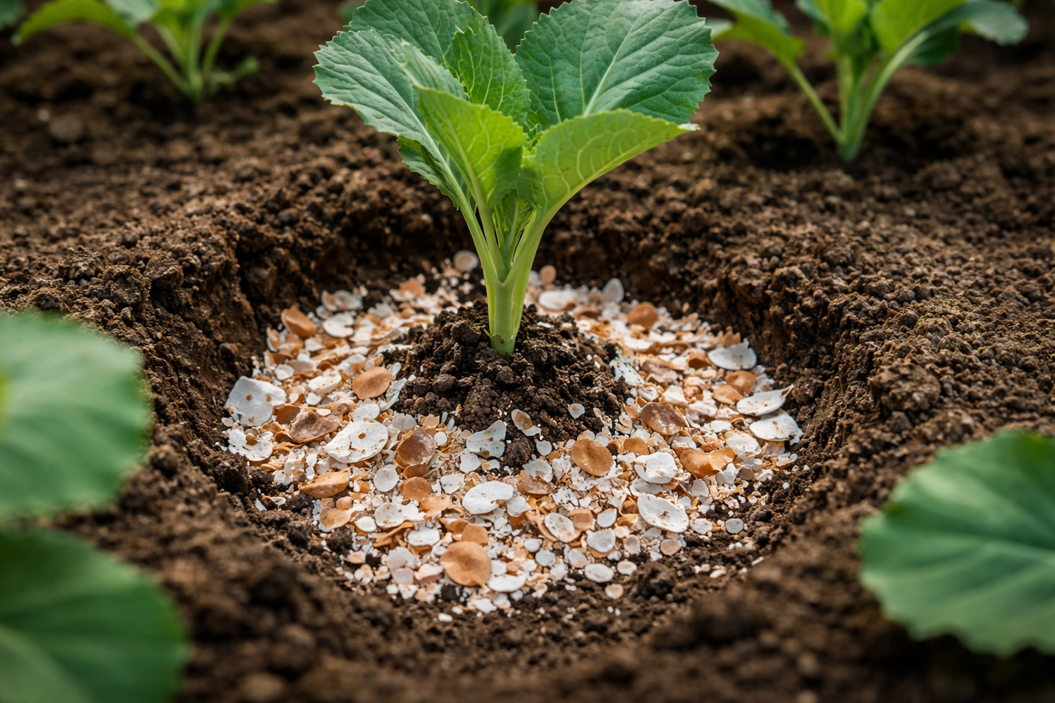 De optimale hoeveelheid is een kleine handvol grondig gemalen poeder per plant.