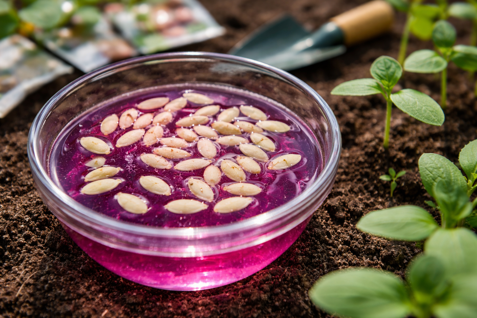 Kaliumpermanganaat werkt als een krachtig oxidatiemiddel en antisepticum. Het verbrandt letterlijk de omhulsels van ziekteverwekkende bacteriën aan het oppervlak van het zaad voordat ze de grond in gaan.