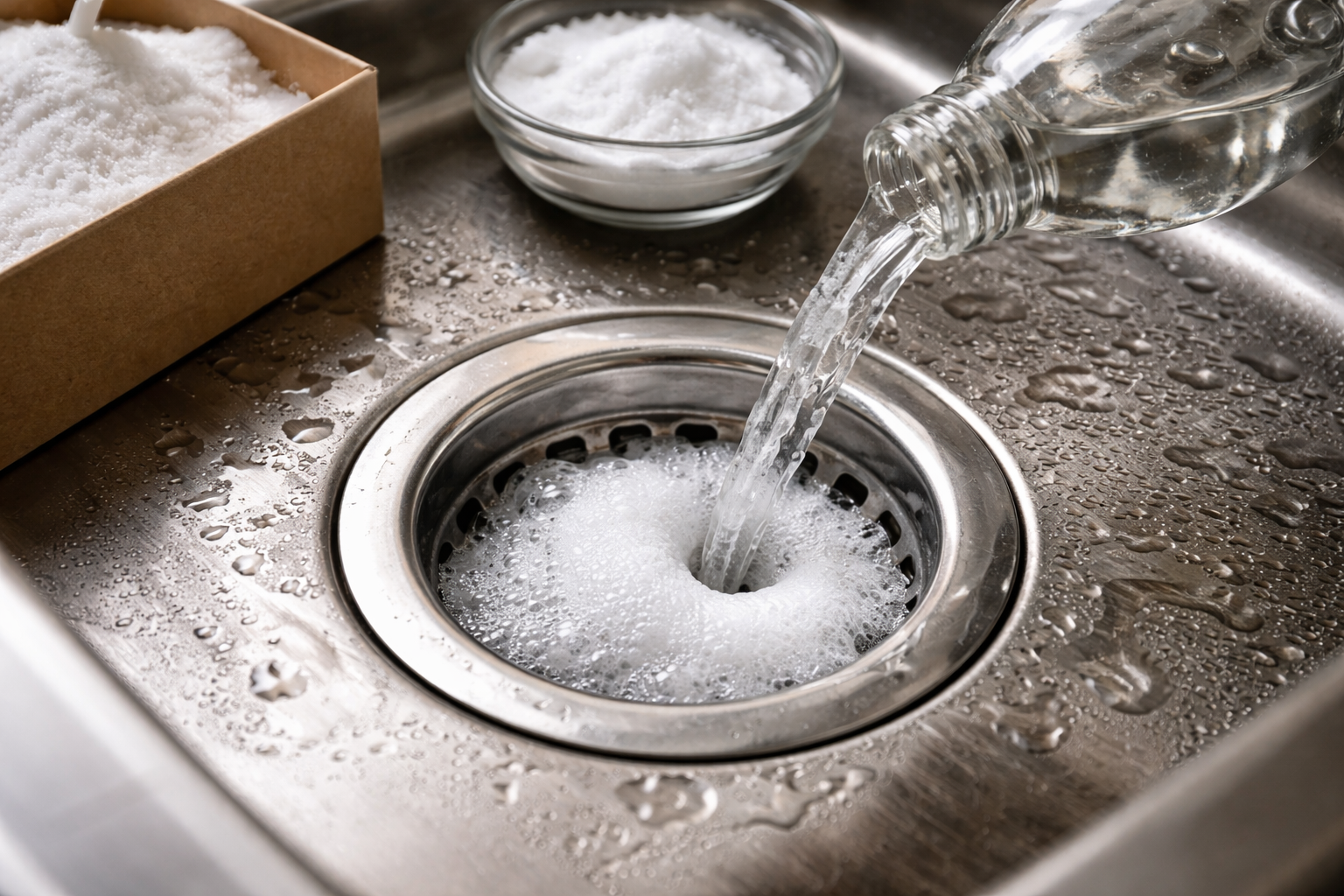 Het belangrijkste geheim voor efficiëntie is om de droge zuiveringszout direct in de afvoer te gieten, in plaats van het van tevoren te mengen met azijn, anders gaat de heilzame bruisende en splitsende reactie verloren in het glas.