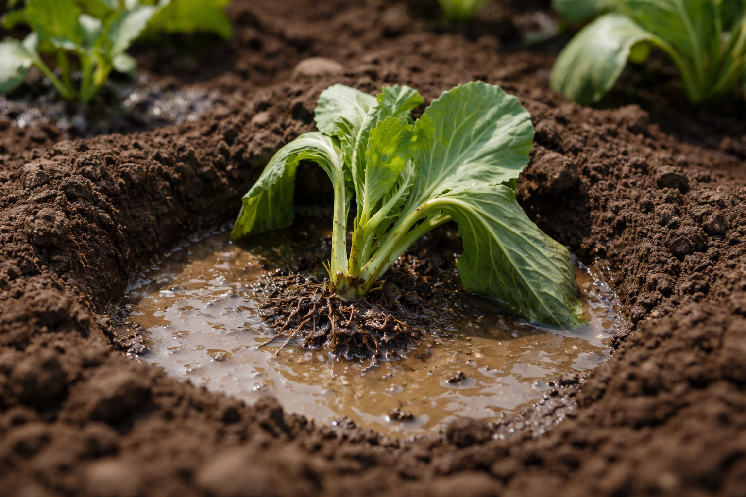 Voedingsstoffen mogen pas worden toegediend als de kool zijn bladeren volledig heeft opgetild en actief groeit.