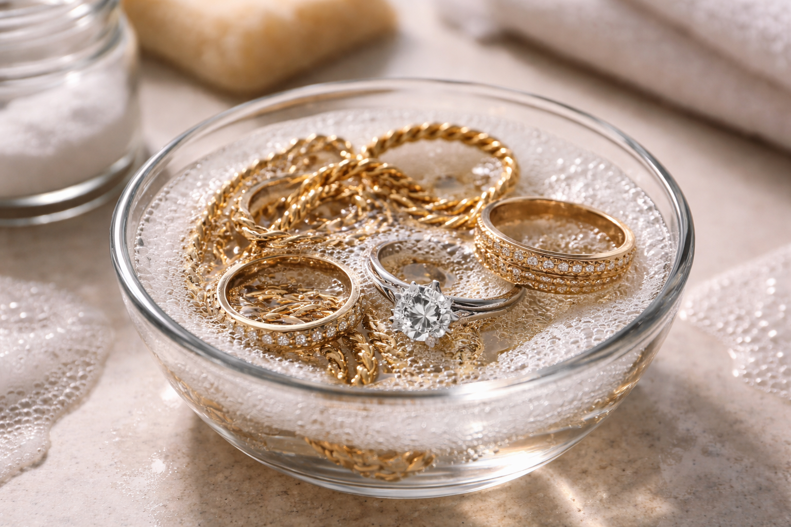 Het belangrijkste geheim van een perfecte reiniging ligt in de temperatuur van het water, het moet gematigd warm zijn om het huidvet effectief op te lossen, maar de sieradenlijm die de stenen vastzet niet te beschadigen.