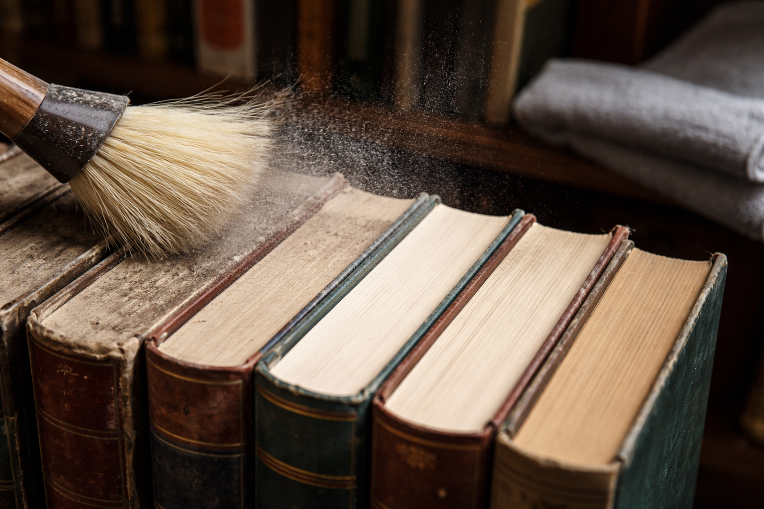 Boekenplanken trekken een enorme hoeveelheid stof aan, dat van een bron van trots verandert in een bron van allergieën en nare geurtjes. In de jaren dat ik met privéarchieven heb gewerkt, heb ik een paar beproefde manieren gevonden om snel de ruggen en kaften er weer perfect uit te laten zien, zonder gebruik te maken van agressieve chemicaliën.