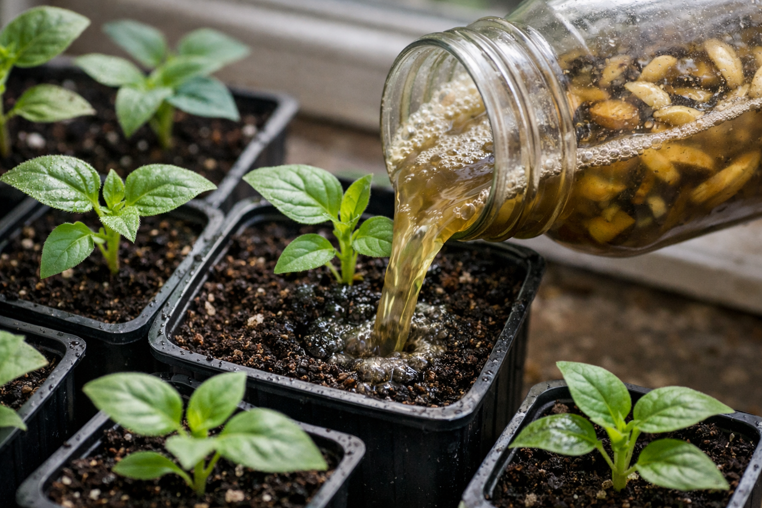 Het belangrijkste geheim van efficiëntie ligt in een goede fermentatie: het water in de pot moet troebel worden en er moet een licht schuim op het oppervlak verschijnen, alleen dan worden de voedingsstoffen omgezet in een vorm die beschikbaar is voor de planten.