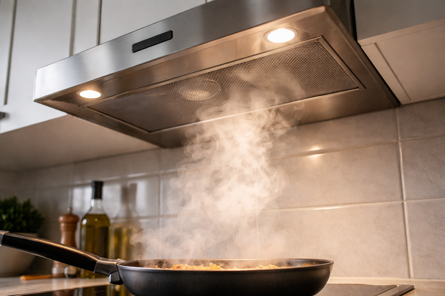 Mijn belangrijkste advies is om de motor minstens drie minuten stationair te laten draaien voordat je de pan op het vuur zet. Dit zorgt voor een krachtige trek boven de kookplaat, waardoor er geen kleine deeltjes hete olie door de kamer vliegen.