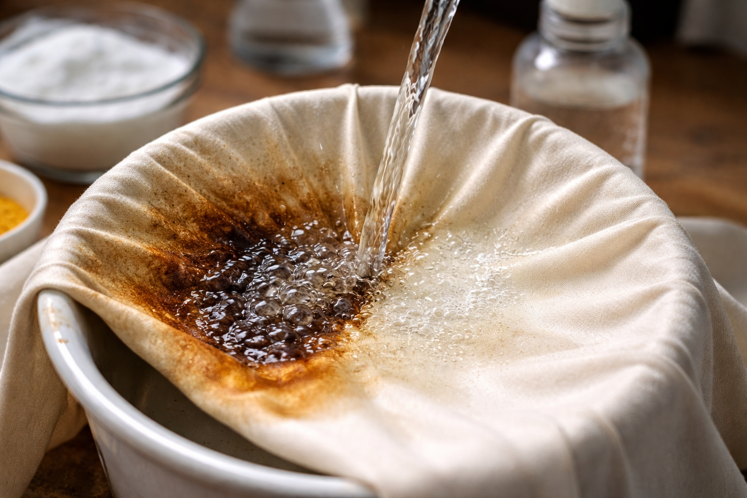 Voor dicht katoen en linnen kun je beter een zuur medium gebruiken. Normaal tafelazijn gecombineerd met water creëert een ideale oplossing voor het neutraliseren van koffietannines.