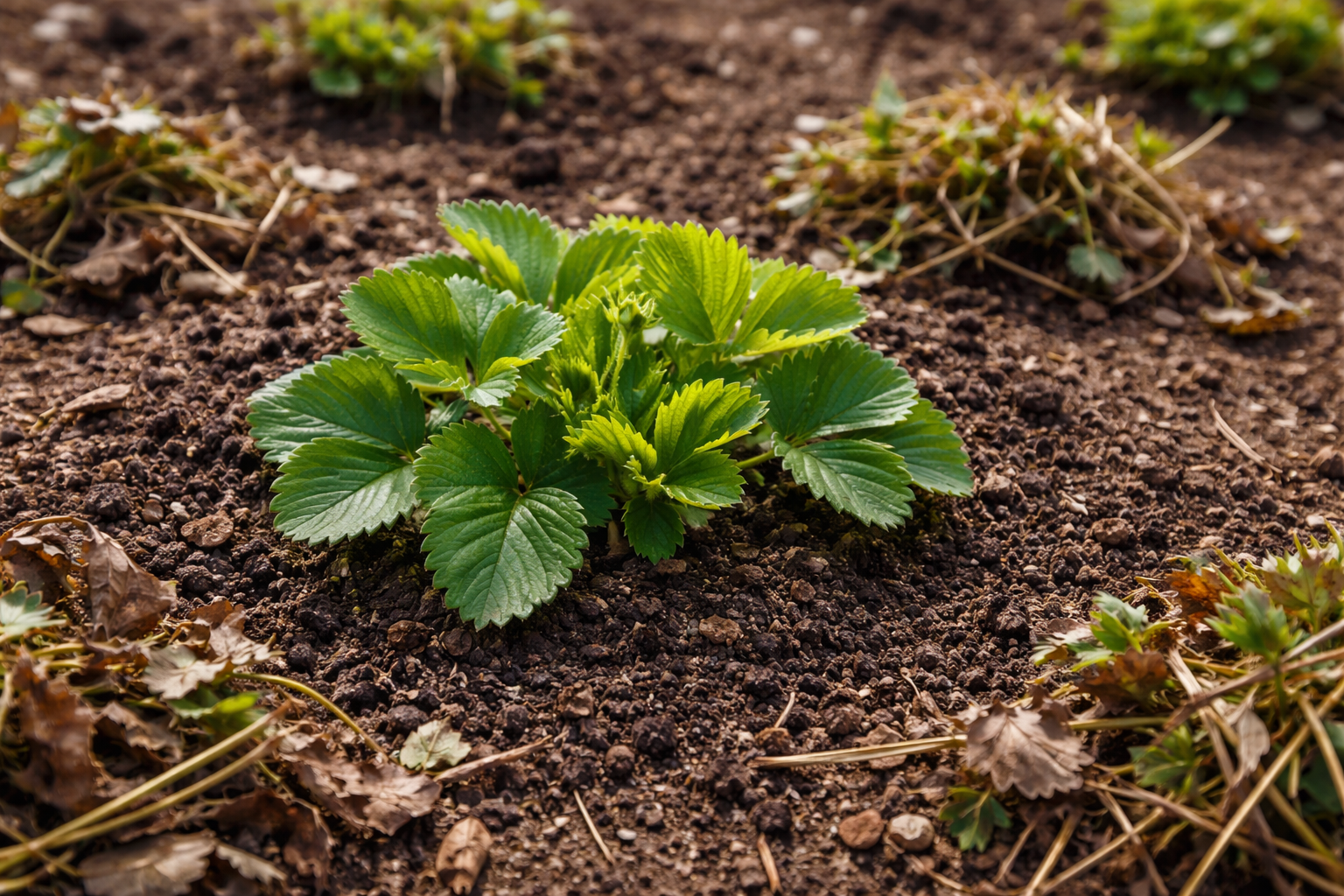 Strooi droog stro in een dichte laag direct tussen de rijen en onder de struiken.