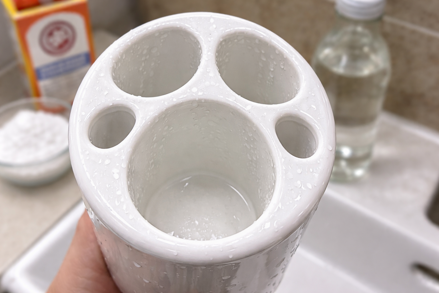Vaak negeren we dit accessoire tijdens het schoonmaken, ook al is dit het accessoire dat in contact komt met onze persoonlijke hygiënische artikelen. Er hoopt zich een dikke massa op aan de onderkant, die moeilijk schoon te maken is met gewoon water. Ik heb veel opties geprobeerd en de beste balans gevonden tussen efficiëntie en veiligheid.