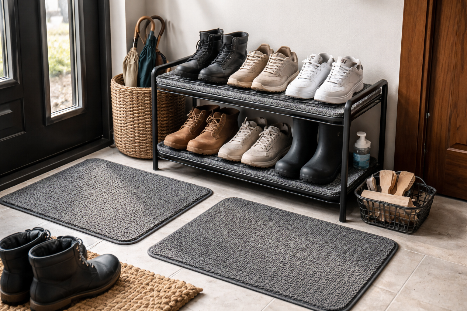 Maak een strikte regel om straatschoenen alleen op de rubberen mat voor de deur te laten staan en berg schone en ongebruikelijke paren op in gesloten garderobevakken.