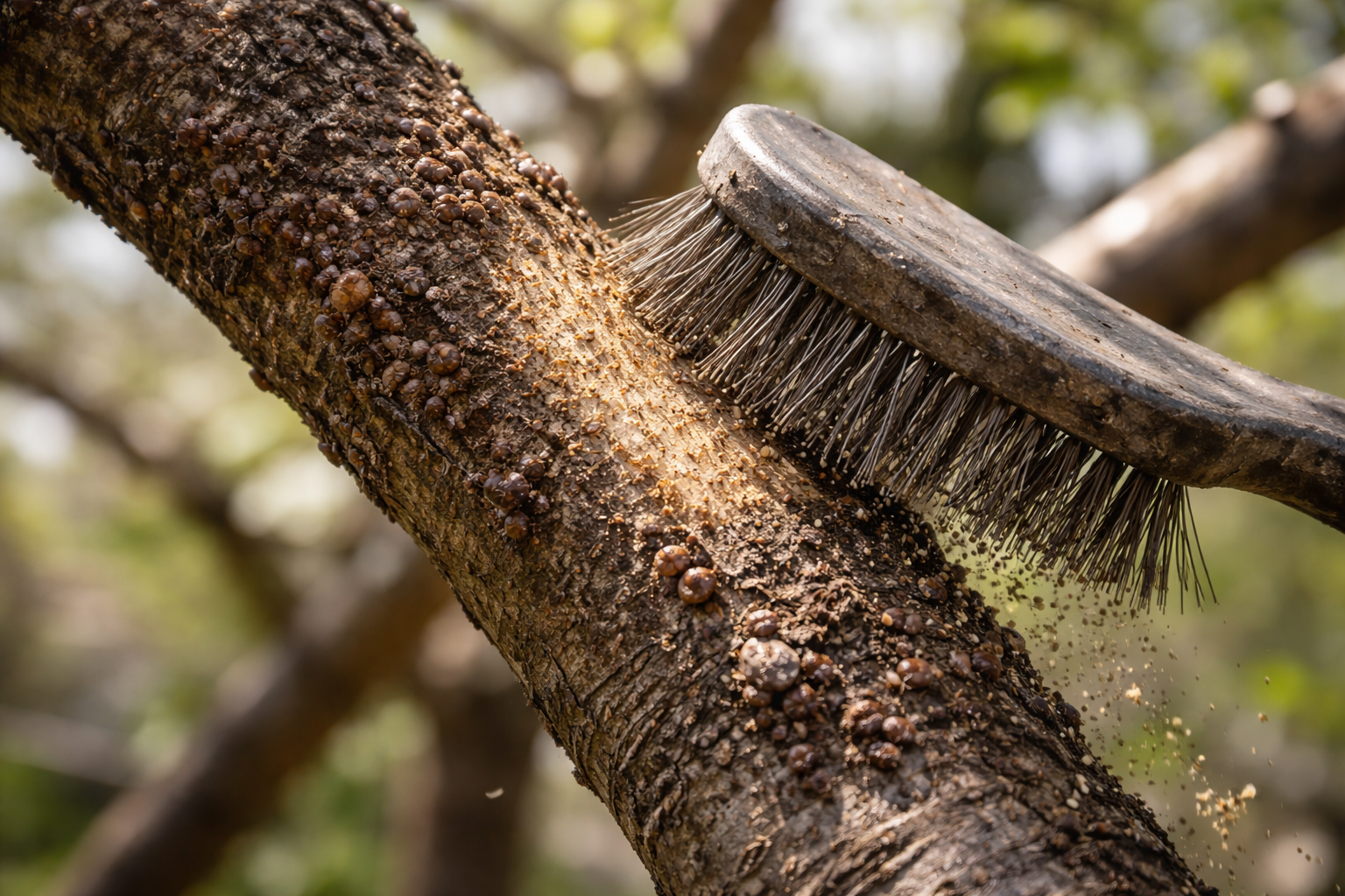 Het eerste wat ik altijd doe is inspectie en mechanische reiniging. Hiervoor gebruik ik een middelharde borstel met metalen haren of een gewone juteborstel. Het is belangrijk om de aangroeisels voorzichtig weg te borstelen zonder de levende bast te beschadigen.