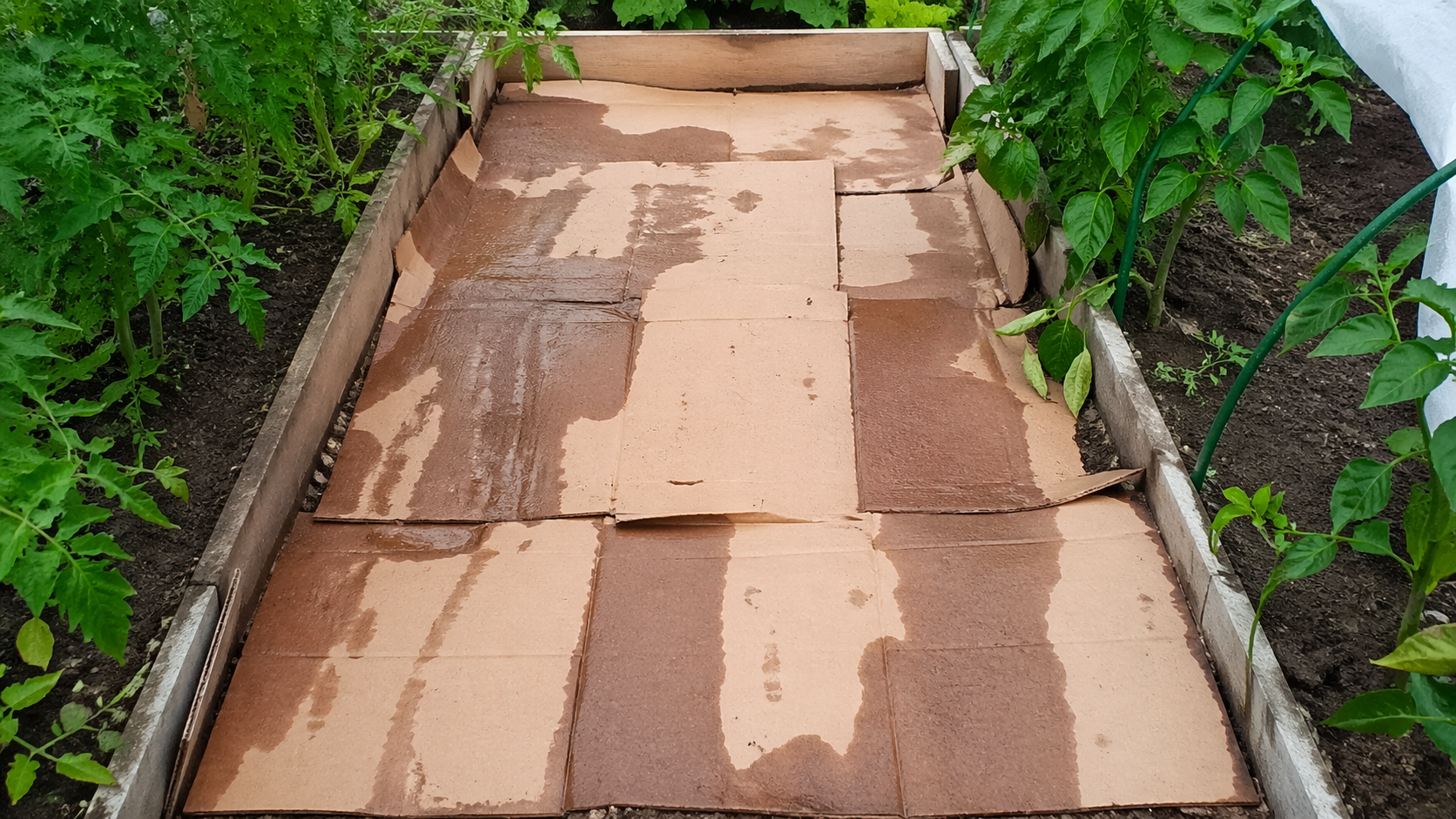 Het belangrijkste geheim van succes is om de grond overvloedig water te geven voordat je het karton legt om het proces van rotten van het wortelsysteem van onkruid te versnellen.